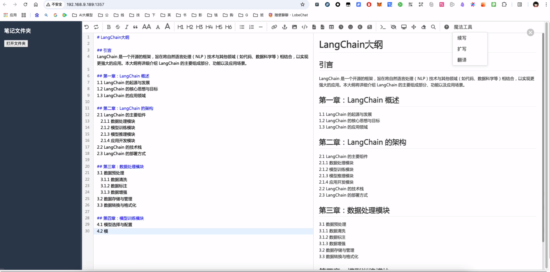 AI魔力笔记,一款支持自部署的本地化笔记软件,完美融合了Markdown语法的实时渲染与强大的AI大模型功能。不仅能让你随时随地掌控自己的笔记数据,还能通过AI实现主题续写、内容扩写和智能翻译,让写作和知识整理变得轻松又高效。