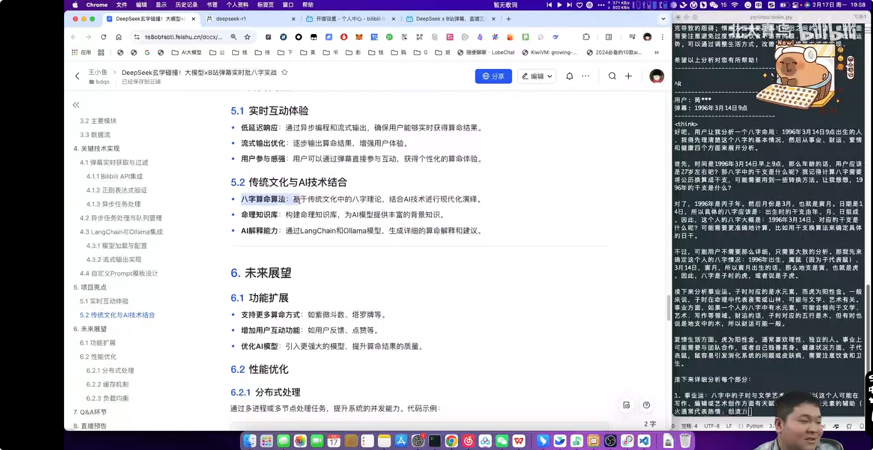 使用AI工具辅助B站直播互动,通过DeepSeek解析弹幕信息,实时响应算命批八字。通过AI能力提升直播体验,提高B站直播留存率。